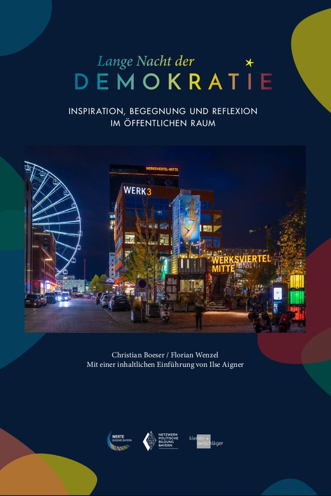 in Augsburg statt. Seit 2018 hat sich das Projekt bayernweit etabliert. Ende 2022 erschien nun eine umfassende Publikation mit dem Titel "Lange Nacht der Demokratie - Begegnung, Inspiration und Reflexion im öffentlichen Raum", verfasst von Christian Boeser und Florian Wenzel. Informationen zur Publikation und eine Bestellmöglichkeit finden Sie in unserem Digitalflyer. Das Buch ist auch im Buchhandel erhältlich.